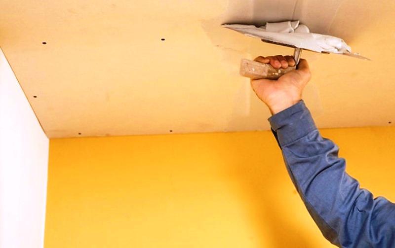 Отделка потолка под покраску начинается с зачистки поверхности до бетонного основания: